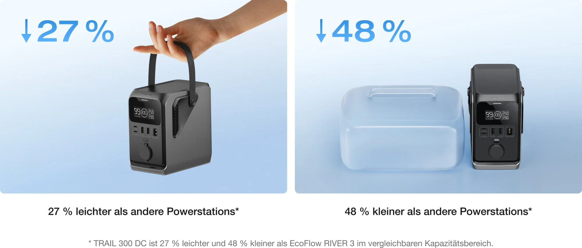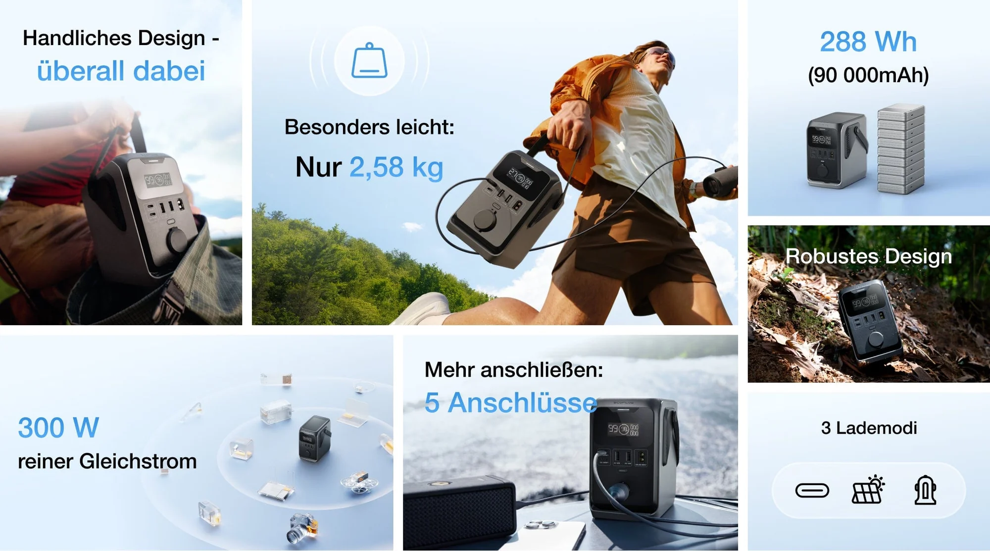 Le courant continu pur fournit une puissance totale de 300 W (140 W max. par prise, y compris la prise 12 V de l'automobile) - suffisante pour 90 % des principaux appareils de plein air. Parfait pour vos besoins légers en électricité en camping.