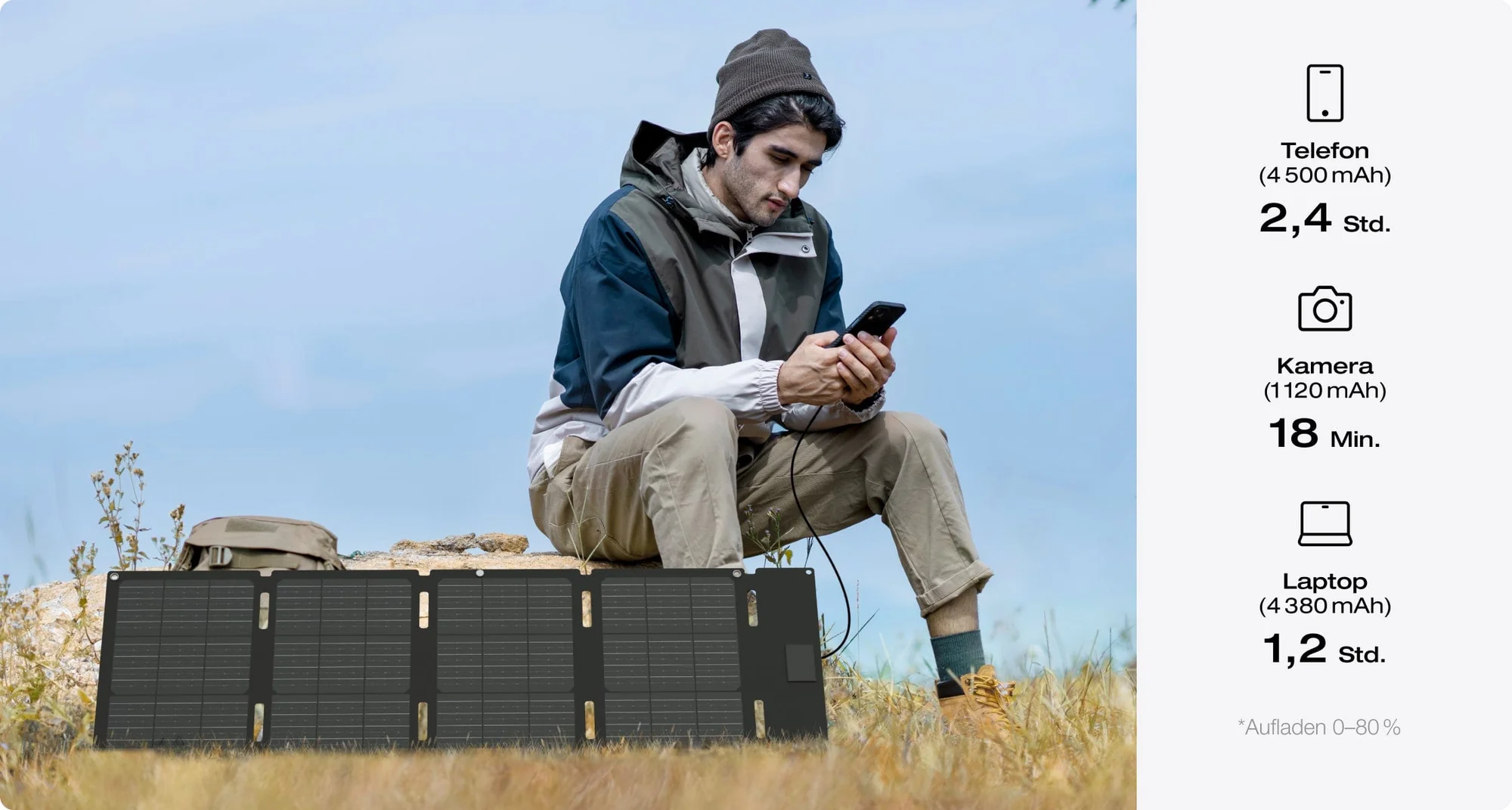For hanging. The portable 45 W solar panel can not only be laid flat on the ground or tilted using a stand, but can also be hung up using the four pre-punched eyelets and hooks supplied. Whether you hang it on your car or backpack, you'll save time by charging on the go.
