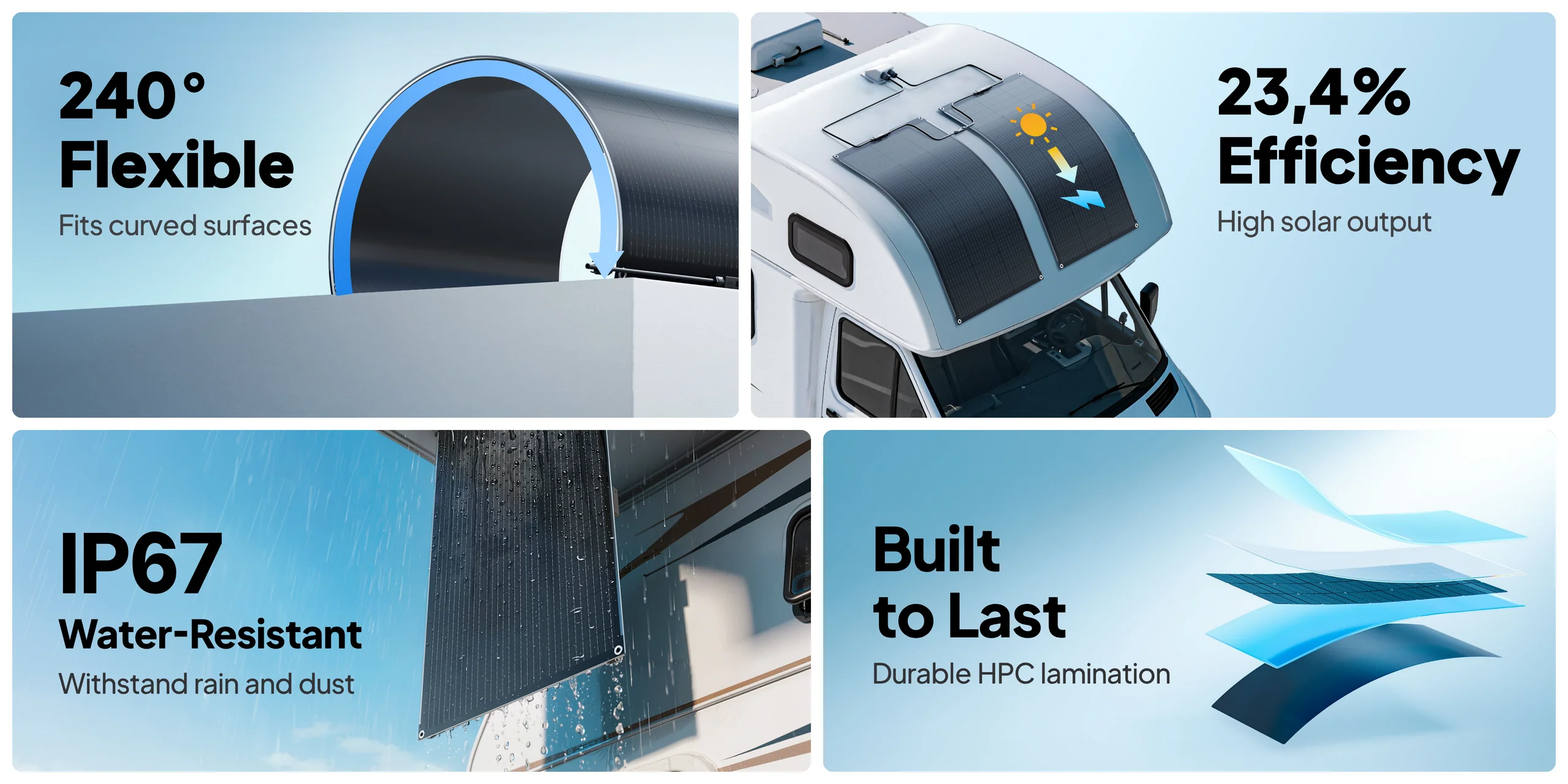 Uma das principais vantagens do Bluetti PV100 é o seu design flexível e fino. O painel adapta-se melhor a superfícies curvas ou irregulares, pelo que é prático de utilizar em telhados de autocaravanas, automóveis, barcos, estruturas móveis temporárias ou outros locais onde um painel rígido clássico nem sempre é prático.